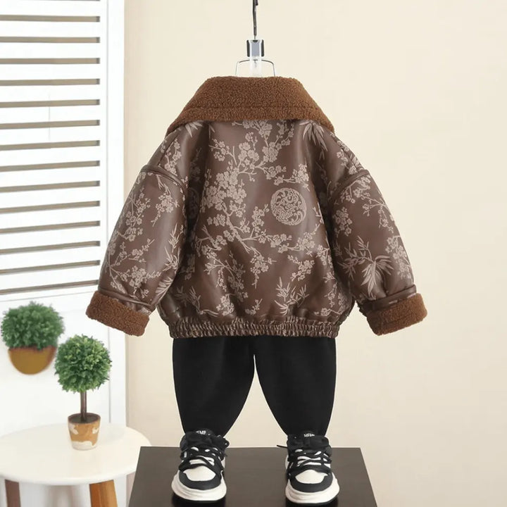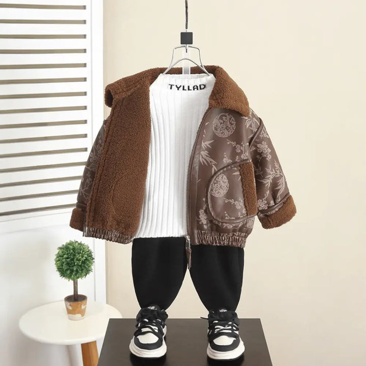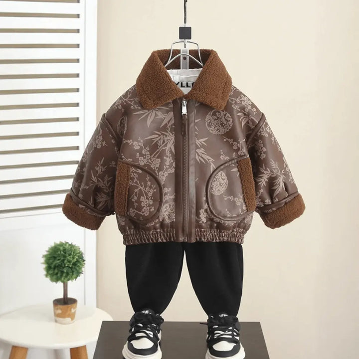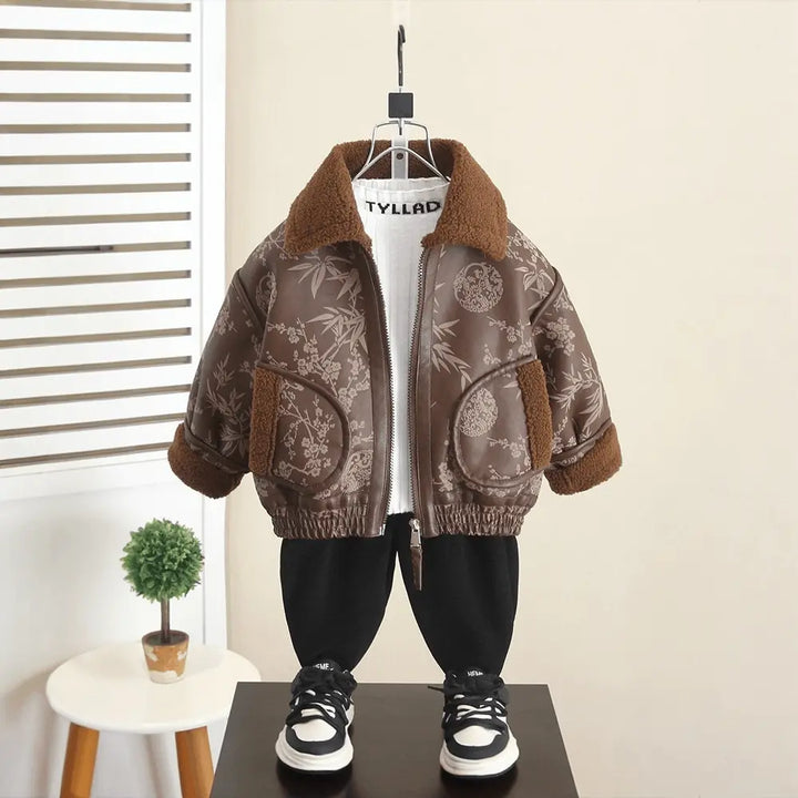 Boys Winter Faux Leather Jacket with Shearling Collar
