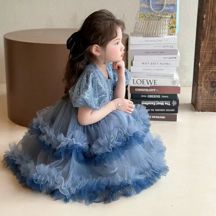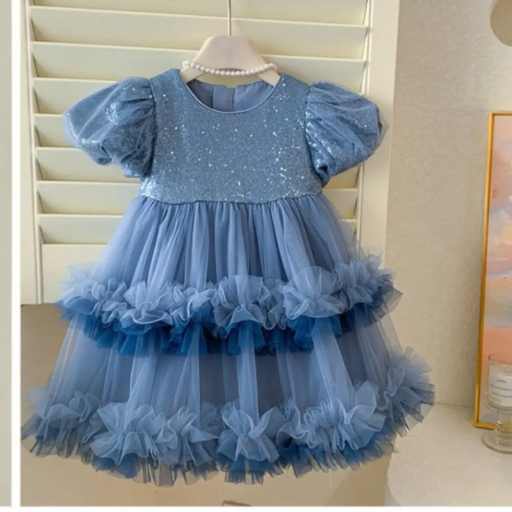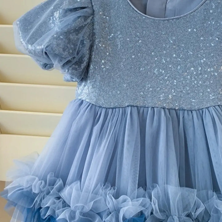 Girls Frill Sequin Ruffle Blue Dress